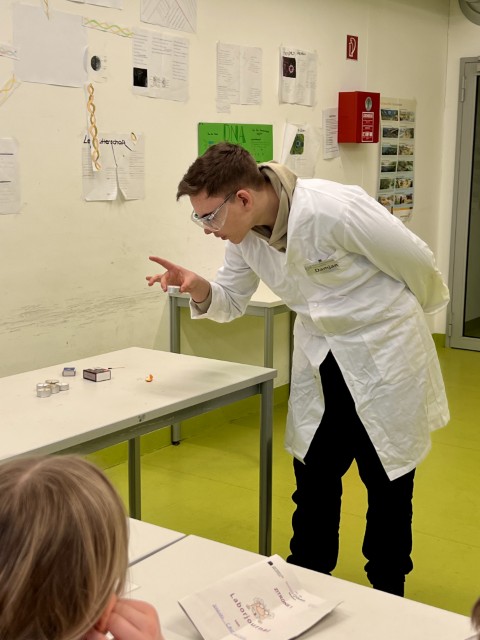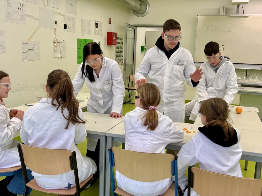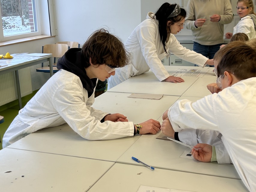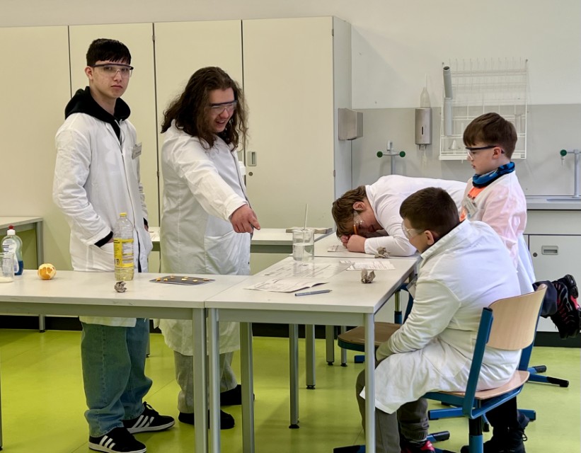 Die SekundarschülerInnen des MINT Profilkurses (Jg. 9) haben sich im „Teutolab Chemie“ der Uni Bielefeld ausbilden lassen, um mit Grundschülerinnen und Grundschülern Experimente zum Thema „Rund um die Zitrone“ in den Räumen der Sekundarschule durchzuführen.