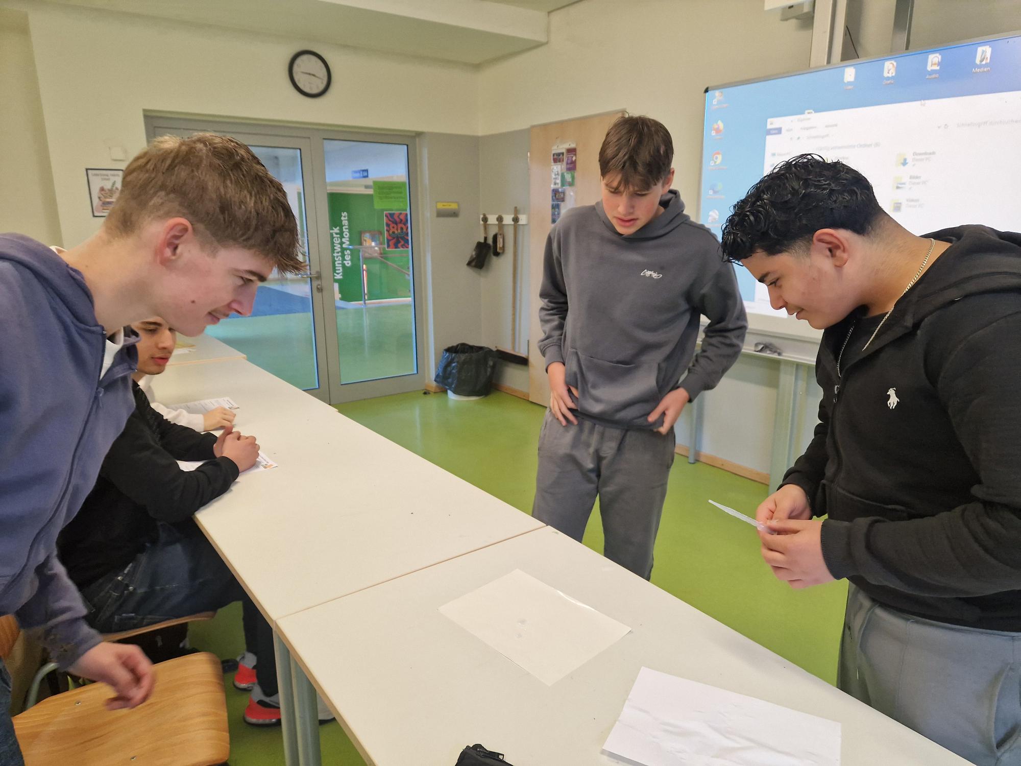 Der Besuch bildete den gelungenen Abschluss der Unterrichtseinheit. Herr Kleine-Tebbe erklärte anschaulich die Idee hinter WaxSolutions: biobasierte Barriere-Coatings für nachhaltige Verpackungen. Mitgebracht hatte er Anschauungsmaterial, sodass die Schülerinnen und Schüler das Produkt direkt selbst testen konnten. Zunächst wurde gewöhnliches Papier mit Wasser benetzt – es wurde weich, riss ein und ließ Flüssigkeit durchsickern. Anschließend probierten sie das beschichtete Papier von WaxSolutions aus: Dieses blieb stabil, und kein einziger Tropfen drang hindurch.