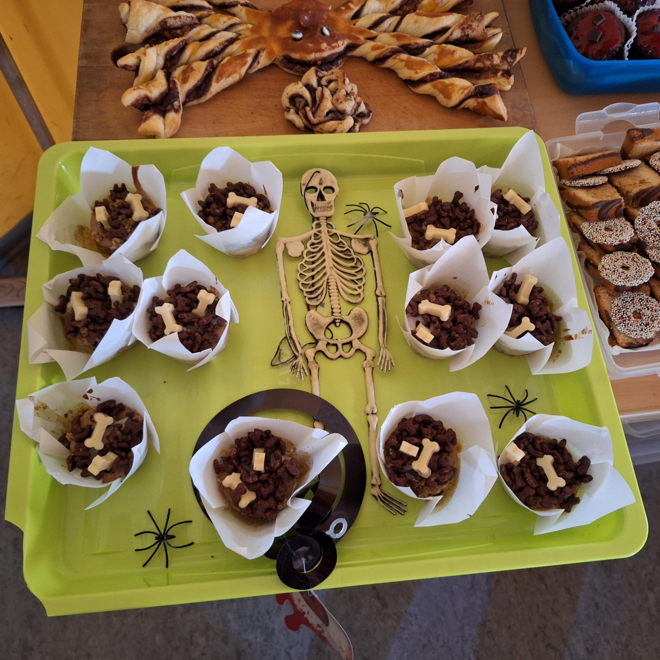 Ein echtes Highlight war das Halloween-Buffet, das von den Eltern liebevoll vorbereitet wurde – von einer „Blätterteigspinne“ über „Knochenmuffins“ bis hin zu „Halloweenpizzen“ war alles dabei.