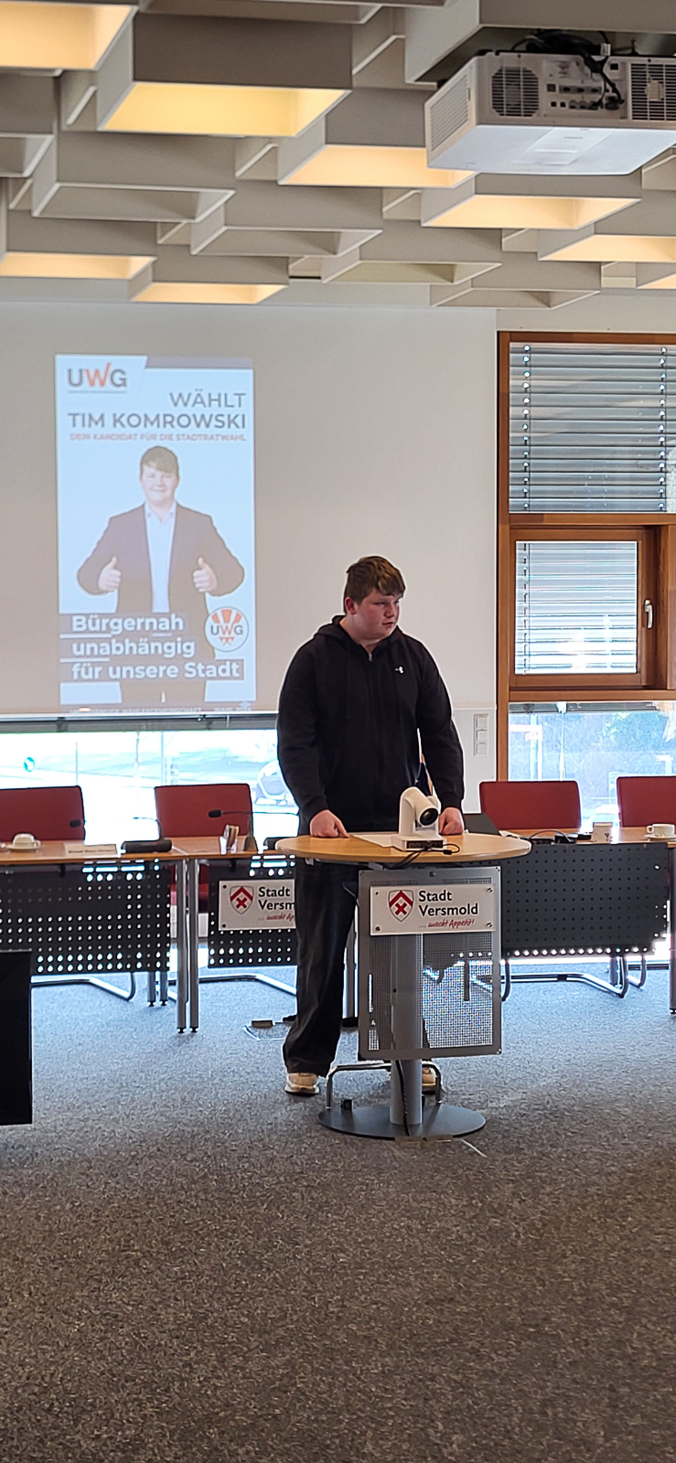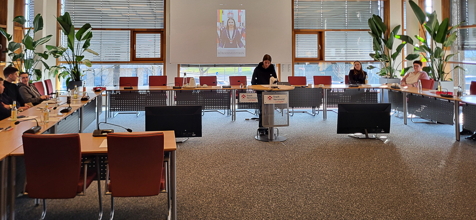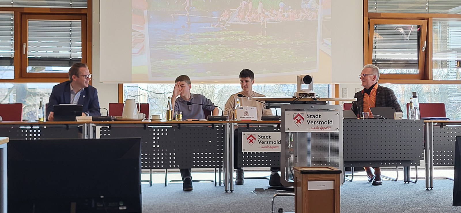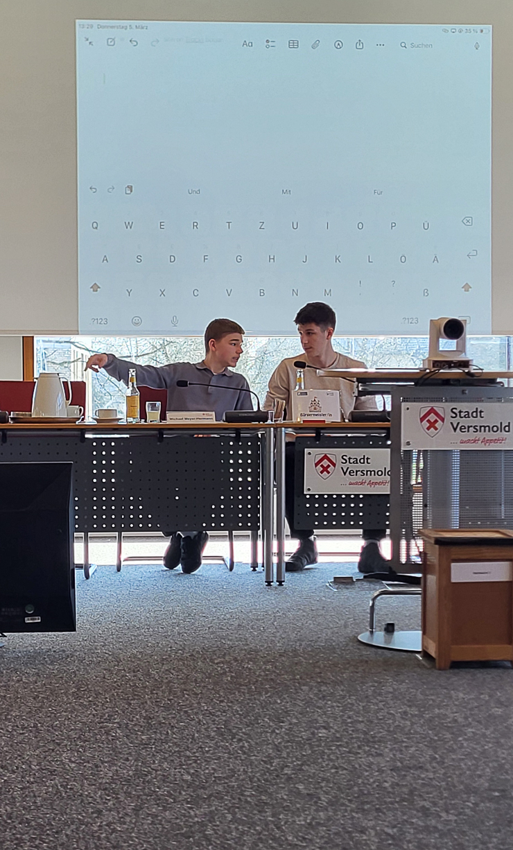 Besonders bereichert wurde das Projekt durch die Anwesenheit von Michael Meyer-Hermann. Der Bürgermeister der Stadt Versmold stand den Jugendlichen mit Rat und Tat zur Seite und gab authentische Einblicke in seinen Berufsalltag. Einmal mehr zeigte er sich dabei als überaus bürgernah: Auf Augenhöhe diskutierte er mit den „Nachwuchs-Politikern“, nahm ihre Fragen ernst und bewies, dass Politik kein distanziertes Geschäft ist, sondern direkt vor der eigenen Haustür stattfindet.