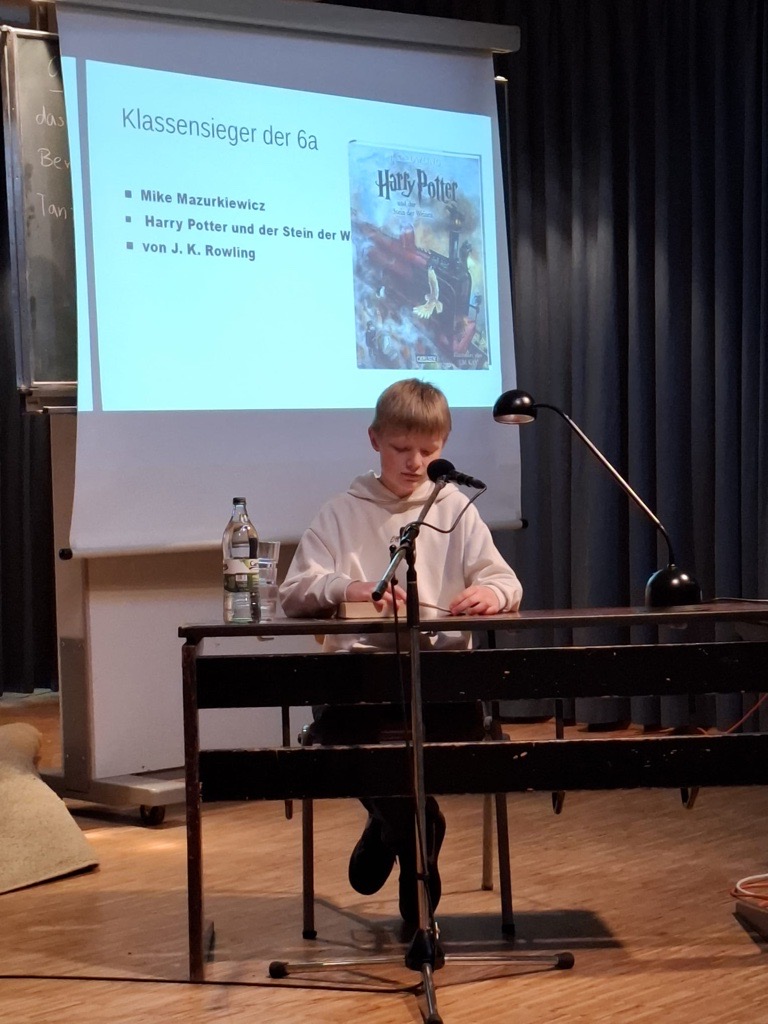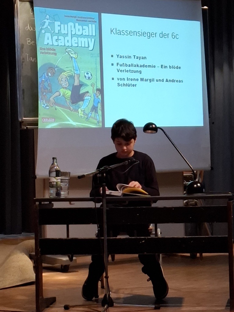 Die zuvor ausgewählten KlassensiegerInnen stellten ihr Können unter Beweis, indem sie in einem ersten Durchgang einen Text ihrer Wahl vorlasen. In einer zweiten Runde mussten sie einen unbekannten Text vortragen. Dieser Text wurde in diesem Jahr von Frau Brüning (Leiterin der Stadtbücherei in Versmold) sowie der derzeitigen Auszubildenden Frau Bextermöller ausgewählt. Die Jugendlichen lasen hier aus dem Buch „Das Schloss der Smartphone-Waisen“ von Salah Naoura vor. Die Leistung der SchülerInnen beurteilte eine neutrale Jury, die aus Frau Brüning, Frau Bextermöller und Herr Wittmann, aus dem Schulleitungsteam, bestand.